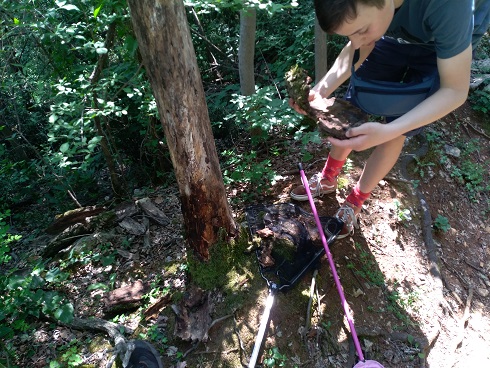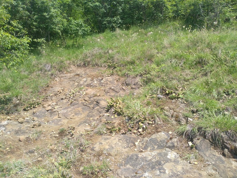 Gradualmente i carpini vengono sostituiti dalle querce e dagli orni e le rocce ignee si mischiano a quelle calcaree. Lungo il tracciato rinveniamo diversi escrementi (che puntualmente mi sono dimenticato di fotografare) sia di uccelli che di piccoli mammiferi, colmi di resti di una bestiola ben nota: Calosoma inquisitor. Mi è capitato più volte di trovare questo bel Carabide in questa zona e in un’occasione esso era presente in quantità considerevoli assieme a chili di bruchi che rodevano le piante circostanti, secondo un fenomeno ben riportato e descritto dal nostro Silvano Biondi e da Roberto Battiston in questo interessante articolo. Le (o i?) Calosoma però le/li manchiamo di poco perché, nonostante il voltare sassi e cercare nel sottobosco, oltre ai resti di loro non c’è traccia. In compenso sul corniolo Nicolai becca qualche cetonia e io, in copula su una foglia, un paio di bei Cerambicidi (Ropalopus o simili).