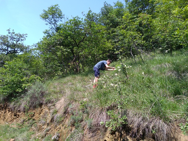 Giunti, coi mezzi motorizzati, in cima alla collina, iniziamo ad avventurarci giù per la stradina, accolti dall’ombra delle piante. Purtroppo i fiori dei biancospini e degli orni, da poco appassiti, non fruttano molto, così ci gettiamo in un praterello verde brillante a lato della strada; sugli steli d’erba sono frequenti gli Elateridi (di una sola specie purtroppo, credo del genere Cidnopus), sui fiori le Oxythyrea e le Tropinota squalida. Nicolai, esultante, avvista un’Anthaxia, ma quella non ne vuole sapere di farsi pigliare e gli sfugge. Ci mettiamo così a scrutare i cespugli di rosa canina in cerca di qualche bestiola floricola, in particolare Cetonini, le prede più ambite da Nicolai: d’un tratto un inconfondibile ronzio ci avverte del decollo di una Cetonia che però, nonostante l’ausilio del mio validissimo retino (vedi foto :mrgreen: ), ci sfugge e, a parte qualche serafico Brachypteroma ottomanum, non troviamo altro.
