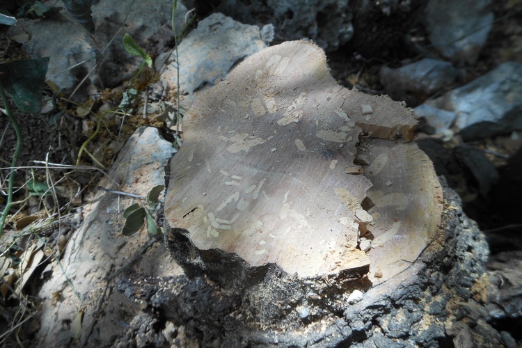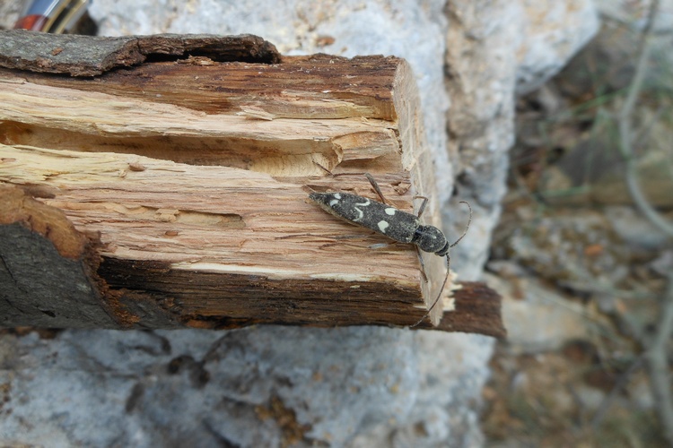 Nelle ombrellifere non troviamo che pochi insetti, unico degno di nota è lo stenopterus creticus. Invece si rivela più fruttuoso l'esame dei cardi fioriti: Sopra di essi è facile rinvenire esemplari di purpuricenus desfontainii desfontainii: A Creta quasi tutti gli ambienti sono antropizzati, ed è facile percorrere chilometri e chiolometri in mezzo agli uliveti e agli agrumeti. In queste zone pochi insetti sono rinvenibili. Il rovescio della medaglia, però, è che quando ci si imbatte, di tanto in tanto, in boschetti di quercia spinosa, quasi sempre è possibile rinvenire attacchi larvali in queste macchie, che fungono da "vivai naturali". Ed ecco finalmente che ci imbattiamo, il 24 maggio, in una bella infestazione di isotomus jarmilae. Come le specie congeneri le larve scavano gallerie interne nei ceppi e nei polloni morti di latifoglie (in questo caso quercus coccifera): Le larve mature predispongono un grosso tappo di rosura per agevolare lo sfarfallamento dell'adulto: Ed ecco una bella femmina estratta dalla sua celletta: Scendendo verso sud, nella provincia di Rethymno, giungiamo alla località costiera di Chora Sfakion. Risalendo la montagna alle spalle di questa ci imbattiamo in un paesaggio spettacolare, dominato da un canjon veramente impressionante: In questa zona ricompare la pineta: Ancora una volta la fortuna ci assiste, grazie al colpo d'occhio del mio socio Giampaolo rinveniamo un grosso ramo secco penzolante da un grande albero arroccato su un dirupo. L'esame del ramo rivela una quantità impressionante di tappi, segno inconfondibile della presenza di pogonocherus ssp.: In conclusione l'avventura si è rivelata molto fruttuosa considerando i circa 15 kg. di legna a testa riportati in Italia. Spero vivamente di poter completare questo resoconto postando le immagini delle varie specie che sfarfalleranno a tempo debito dalle varie essenze prelevate (ceratonia, pinus, ficus, nerium, euphorbia ssp., quercus, acer, asphodeline luteina). Spero vi siano piaciute le foto!