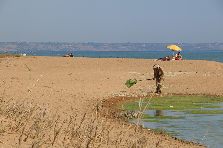 Aria così rovente e umida che le mosche non volavano: nuotavano. Anche le unghie sudavano mentre sterminate distese di carne semignuda spalmata di olio e altri condimenti per zanzare si crogiolava al sole o si immergeva in la salamoia. Marcello dopo un timido e doveroso tentativo col retino, sfoderava il suo piano B: costume e bagno a mare. Io sbivaccato all'ombra dell'unica tamerice. Maurizione girava agghindato in triplice strato comprendente. giacca beige modello sahaariano, gilè sottostante in tela multitasking (ovvero 39 tasche dove portare tutto quel che possa servire e che non troverai mai quando ti servirà), camicia sempre color sabbia a contatto pelle legata al collo da elegante papillons a fantasia mimetica. Completavano l'adeguato look retino entomologico verde fosforescente e scarpone traforato per la fuoriscita dell'acqua in caso di immersione. Qualcuno lo guardava incuriosito. Libellule quasi nulla, benchè Maurizione sfoderasse la sua arma più potente: l'ipnosi... Al terzo giorno il numero delle catture era inversamente proporzionale alla sicula canicola. Potevamo rifarci a Favignana. Giungiamo in tarda mattinata sull'isolotto, doverosa birra nella piazza, e noleggiamo due bici e per dirigerci verso una pozza costiera dall'altra parte dell'isola. Dopo aver affrontato il mostruoso dislivello di circa 28 metri e pedalato per un paio di chilometri, sudati come cammelli, troviamo una misera pozza secca come le nostre riarse gole. ma finalmente la fortuna ci arride e, sotto una pietra, scavando appena il terreno secco vengono finalmente fuori i Princidium laetum e tante altre belle bestiole. Una ventata di allegria finalmente