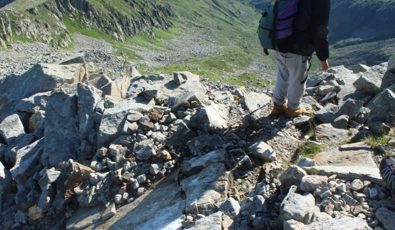 Ormai siamo ben oltre il limite degli alberi e il paesaggio è quello tipico del pascolo alpino, con qualche arbusto sparso e molti sassi da girare. Inizia ad esserci un po' nuvoloso e, guardandoci intorno, notiamo che la Cima di Bò è completamente avvolta dalle nuvole. Ricordandomi di un video visto prima di partire per avere un'idea dell'ambiente (lo lascio anche qui)