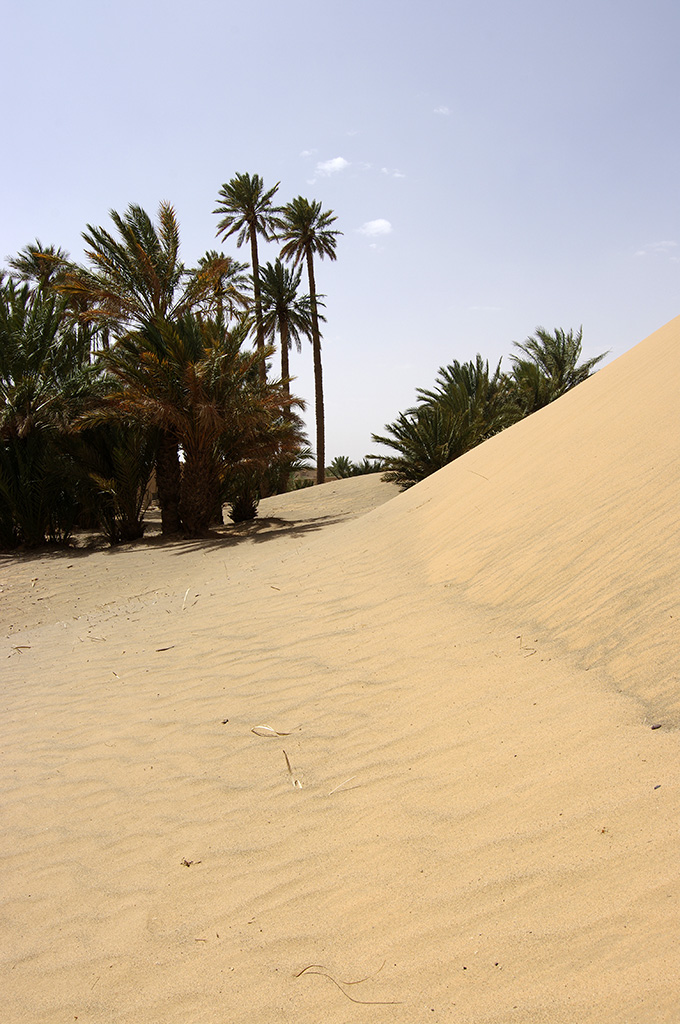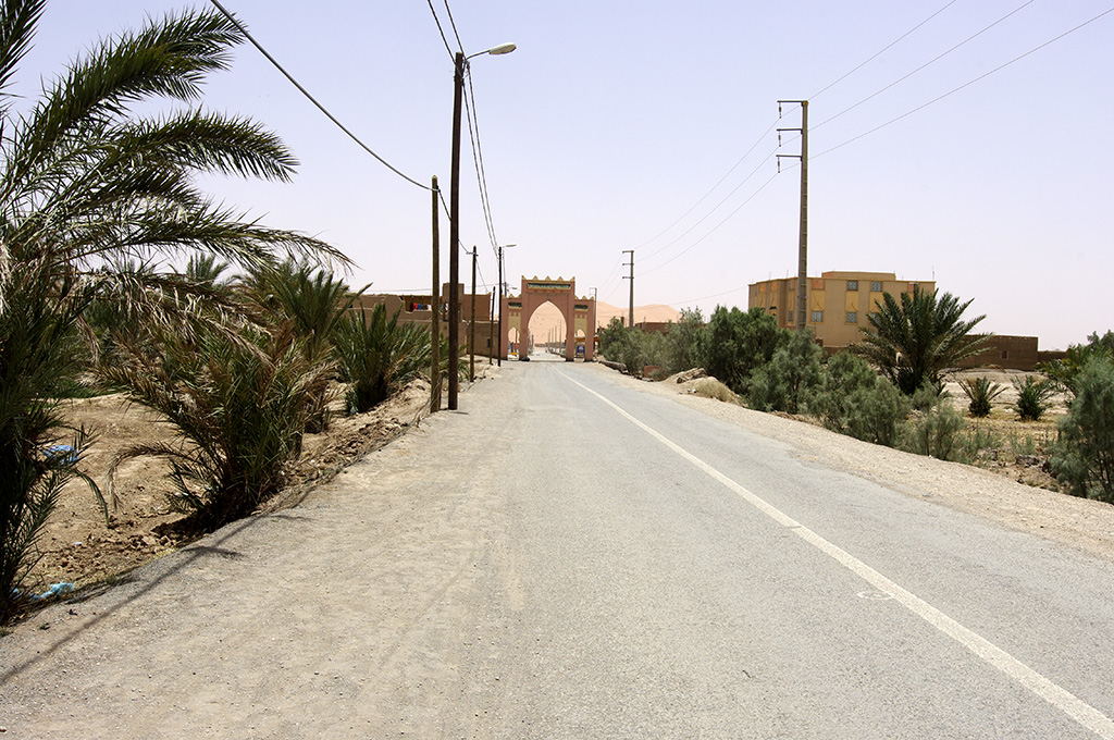 Sesto giorno (02/06/2012)Tragitto sesto giorno Il mattino ricarico i bagagli e parto in direzione sud, verso Merzouga. Oasi dello Ziz A Erfoud mi fermo a comprare acqua e pane ed un berbero mi chiede se voglio visitare le zone della città dove sono stati girati i film Marrakesh Express, il Thè nel deserto, ed altri, ma declino riferendo (mentendo) che sarei tornato l’indomani. A sud di Erfoud mi fermo a cercare e trovo pochi insetti. Riparto, raggiungo Rissani e, infine, arrivo a Merzouga. Ingresso di Rissani Vado nel paese e subito vengo fermato da un ragazzo del posto che mi vuole mandare in un hotel “di fiducia”; per fortuna ricordavo il nome che mi era stato detto dal ragazzo di Meski, così ho risposto che già mi aspettavano a quell’altro hotel; mi è stato chiesto di poter accompagnare un signore di una certa età verso le dune (3-400 metri) così l’ho fatto salire e l’ho portato dove voleva; questo ha cominciato a chiedermi se volevo essere accompagnato al lago dei fenicotteri rosa, oppure a fare un’escursione in un villaggio di “uomini neri” lì vicino, o ancora andare nel deserto con i cammelli, ecc. Ho declinato tutti gli inviti ma questo non ne voleva sapere di smettere, per cui sono ripartito con l’auto e nel fare manovra …….. mi sono insabbiato  . Il tizio mi ha dato una mano a ritirare fuori l’auto dalla sabbia, così mi è toccato anche dargli qualche soldo. Raggiungo l’hotel che mi era stato indicato e mi sistemo in camera. Hotel con terrazza posteriore direttamente sulle dune di Erg Chebbi. Uno spettacolo! Mi accordo per la cena e vado a fare una camminata sulle dune e tra le poche palme presenti, munito di buona scorta di acqua. E’ un caldo micidiale. Rientro in camera e mi fiondo sotto la doccia. ..... segue sesto giorno .....