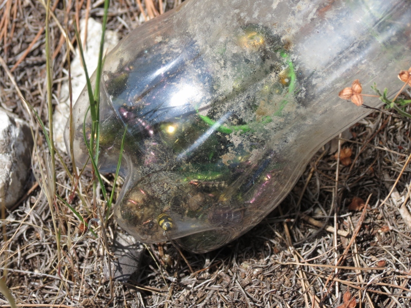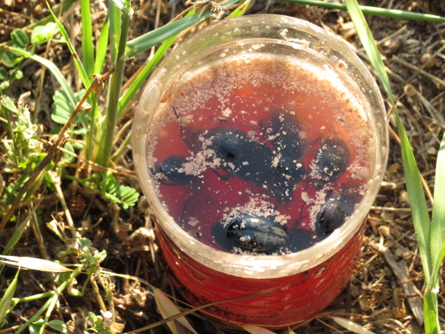 un'altro problema in una terra cosi' arida e calda le trappole ad aceto dopo 3 settimane sono aciutte totalmente ( ho quindi deciso di acquistare bicchieri molto piu' profondi contenenti piu' liquido ) in questo modo le bestiole si asciugano vanno in putrefazione e sono tutte da buttare questa e' l'unica trappola asciutta trovata su oltre 10 messe nella stessa localita' era completamente al sole conteneva circa 40 tra Carabidi e Tenebrionidi tutti ( poveracci .. morti senza motivo ) da buttare ....