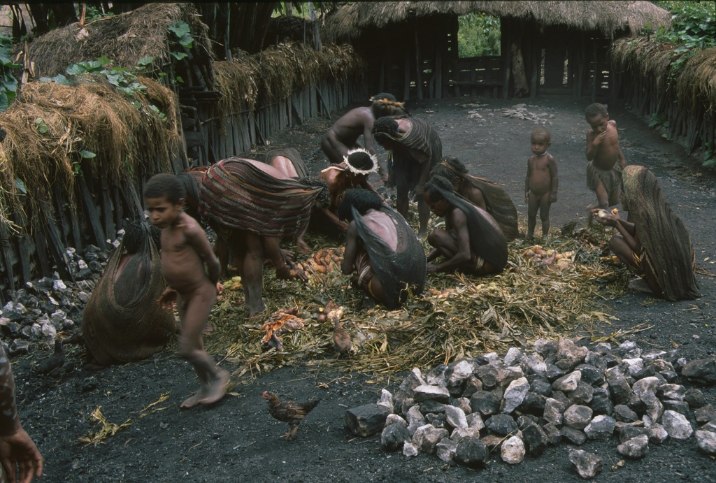 Durante le cerimonie e le feste il cibo viene cucinato in delle buche nel terreno dove vengono poste delle pietre arroventate, il tutto viene poi coperto con foglie di palma e di banani e lasciato cuocere lentamente.
