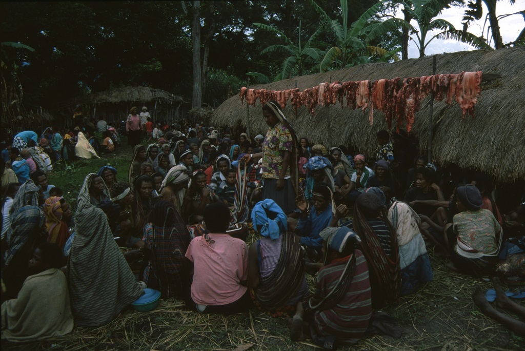 Prima di essere cotti i maiali vengono sventrati e la carne appesa a dei pali in tutto il villaggio, più il defunto era importante più maiali si uccidono. La carne viene poi distribuita a tutti i presenti, in questo modo si pagano debiti, si risarciscono danni ed uccisioni, si acquista prestigio, si stringono alleanze e si concludono affari e matrimoni; alle cerimonie partecipano persone provenienti da diversi villaggi ma sempre e rigorosamente appartenenti alla stessa etnia (gli altri sono tutti potenziali nemici).