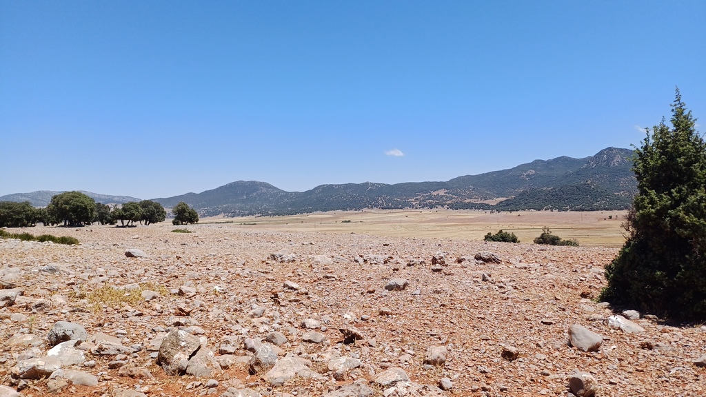 Poi direzione Taza attraverso l'autostrada A2 e poi una bella salita con vari tornanti sino ad arrivare nel territorio montuoso di Tazzeka. Con Carlo ci incontriamo in una stazione di servizio in autostrada e proseguiamo con le nostre auto sino a destinazione. Arriviamo con il sole fortunatamente ancora un po' alto nel vasto pianoro di Dayet Chicker, circondato da rilievi non particolarmente alti ricoperti soprattutto di lecci, anche di dimensioni notevoli. È tempo di mietitura e in tutta la piana risuonano voci e i suoni delle mietitrebbia e delle macchine che confezionano le balle di fieno. Non c'è particolarmente caldo, anzi soffia un vento fresco.