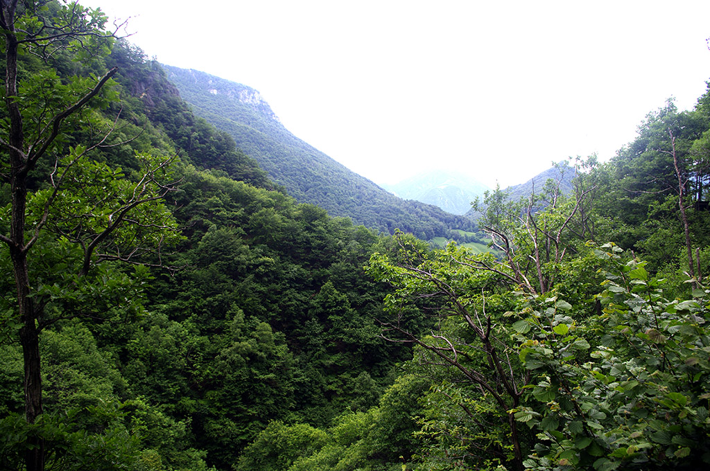 Vista dalla parte medio alta del Canale Teagiolo, verso valle (Introbio) .... in quel punto il sentiero scorre a mezza costa in boschi misti di latifoglie.