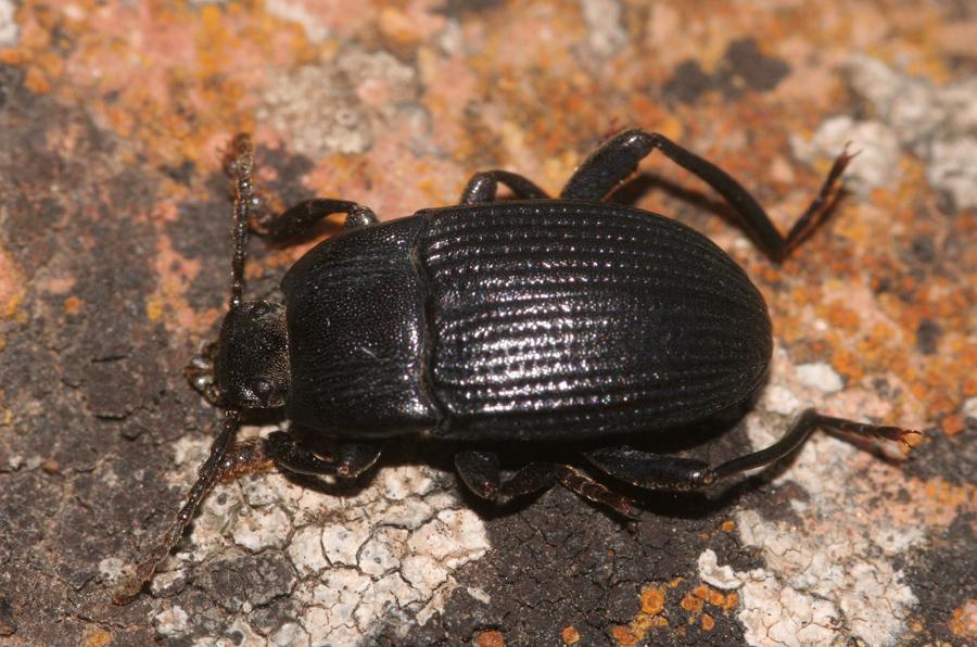 Gli insetti come c'era da aspettarsi esplodevano in ogni direzione: sotto pietre, a svolazzare fra i fiori, nascosti fra le cacche. Scavicchiando queste ultime oltre a tantissimi Aphodiini, Onthophagini e tanti altri coprofagi erano comuni i Sysiphus schaefferi: Vagavano invece liberamente questi geotrupini che mi sembrano Trypocopris pyraeneus cyanicolor (la foto non rende gli splendidi riflessi violacei delle elitre) Comuni alle basi dei tronchi gli splendidi benchè comuni Morimus asper: Fra gli altri cerambicidi incontrati le Opsilia coerulescens abbirbicate in allegra attività sui cespugli di Echium: Un elegante Certallum ebulinum: E aggrappati su Galactites questa strana Agapanthia che non ricorda nessuna di quelle che finora ho incontrato in Sicilia e su cui non mi pronuncio chiedendo a voi lumi: Sollevando pietre ho raccolto queste due specie di Pedinus che confesso adesso non ho voglia di andare a verificare  : Ecco il primo: Ed il secondo: Sempre sotto pietre questo minuto carabide: Sotto le cortecce erano comuni questi elateridi: Arrivati all'Urio Zilio, un piccolo stagno situato nel cuore di una fitta querceta (Roverelle s.l. e Cerri soprattutto) comincio a guardarmi intorno in cerca di libellule, tra l'altro in questa zona è segnalata l'Enallagma cyathigerum ma complici il vento fastidioso e insistente e un cielo coperto gli odonati non si sono fatti vedere. Ecco l'urio Zilio: In compenso sguazzavano in acqua questi coleotteri in un bagno non desiderato: Su un albero ormai secco nei pressi dell'urio abbiamo assistito a una scena stranissima, quasi surreale: dai rami rinsecchiti pendevano decine di filamenti su cui erano aggrappati grappoli di bruchi: Dopo la camminata un pò stanchi siamo ritornati a una radura a circa un km dall'inizio del percorso dove abbiamo piazzato la tenda e preparato la lampada di Wood per cercare qualche insetto notturno....