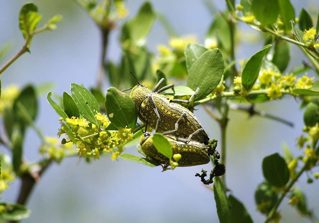 Ce ne sono a decine su tutti i cespugli di quell’essenza (che poi ho saputo essere Giuggiolo). Ne raccolgo di due specie diverse (J. aequinoctialis e J. bleusei). Trovo anche Cetoniini e Meloidi.