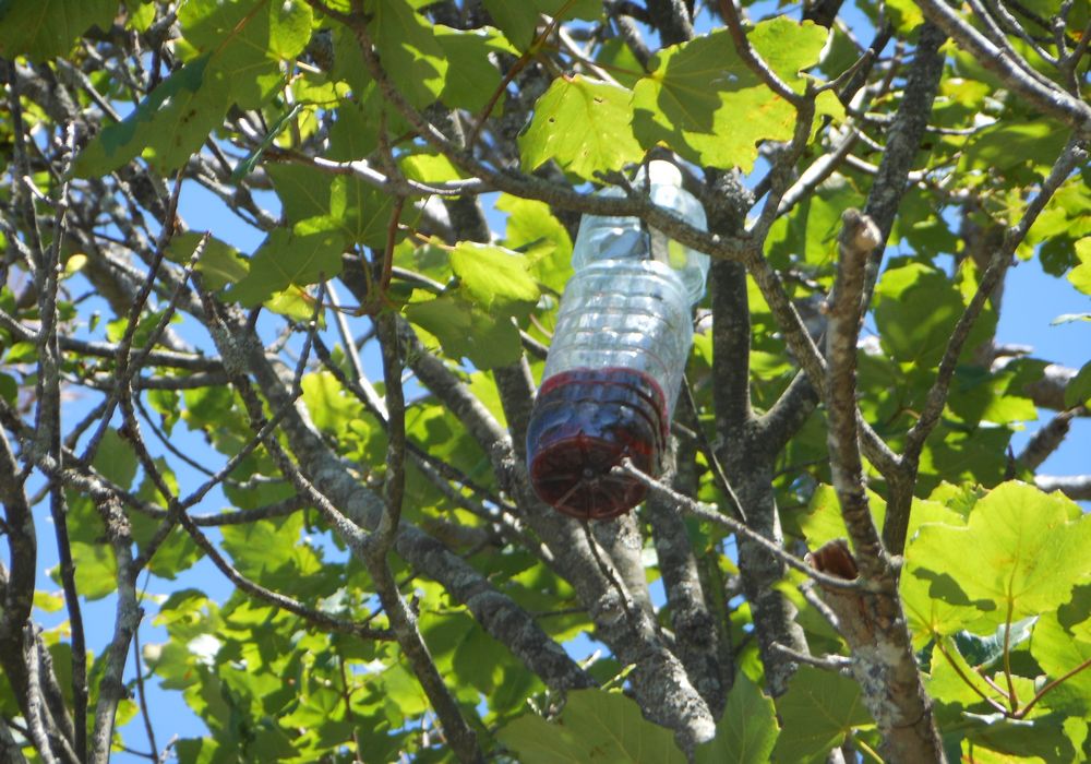 Ogni bottiglia viene riempita con circa 30 centilitri di miscela (praticamente con un litro di miscela riempio 3 trappole in media...) ed appesa ai rami degli alberi prescelti con l'ausilio di una canna da pesca di 5 metri riadattata allo scopo.