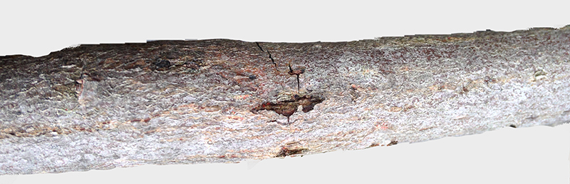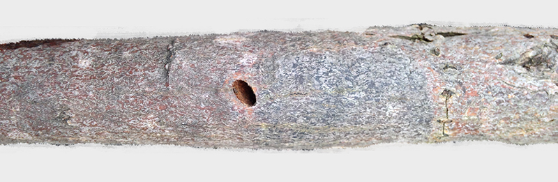 In queste due immagini si vede un rametto di ca. 3 cm di diametro fotografato da davanti e di dietro. Non dimostra evidente ingrossamento, ma una altra caratteristica sempre presente. Sono quelle piccole crepe trasversali della corteccia e quel alone, che con parole poco tecniche ma esplicative chiamo il "livido". Infatti la porzione di corteccia fine che copre la zona di attività della larva sottostante assume un mutamento del colore grigiastro della corteccia sana e diventa leggermente bluastra-violacea, ben delineata da una sottile linea grigio-giallognola e di forma più o meno ovale. Appunto come un livido. Questi due sintomi insieme assicurano la presenza della larva. Non è facile trovarli ma una volta visto uno e compreso il complesso, si individuano da lontano.