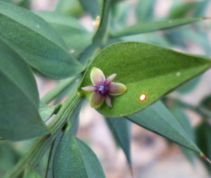 Scrutando meglio le foglie di pungitopo mi accorgo che ci sono delle strane infiorescenze sul retro delle foglie! Non le avevo mai notate e sono bellissime!!! anche se minuscole!!!