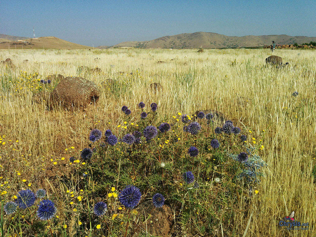 L'ambiente è molto ampio e ricco di fiori, cardi, ombrellifere, una fila infinita di massi a secco e varie macchie di Eryngium e di Echinops sp. (Asteracee), particolarmente spinosi: