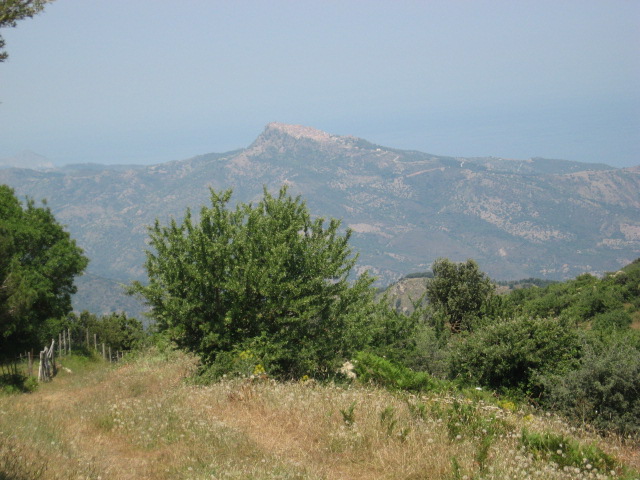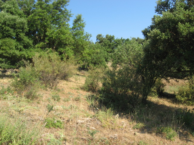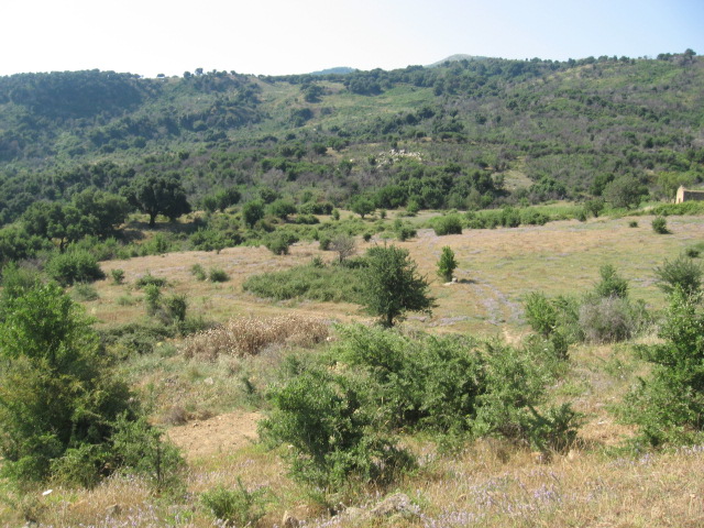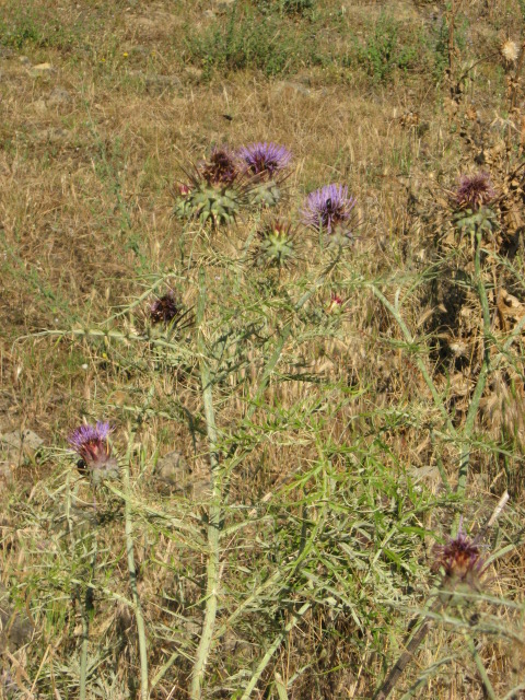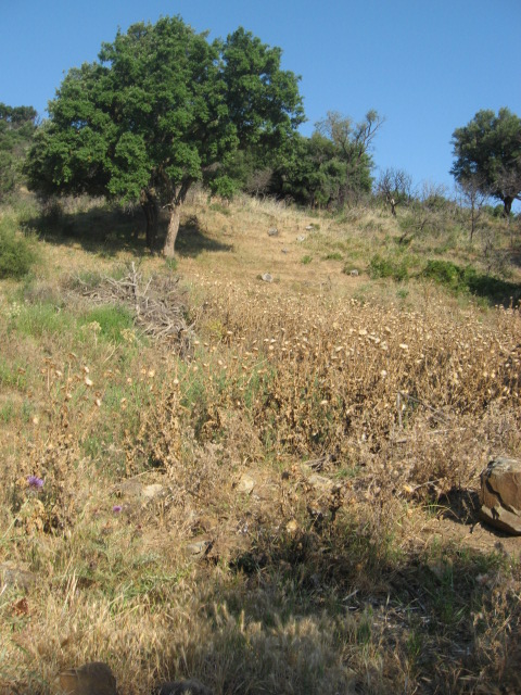 Comincio a esplorare le sugherete di Piano d'Olmo (617 m s.l.m.). Fra le sughere, alcune delle quali morte in seguito a un terribile indendio dell'estate 2012 che ha interessato tutta la zona, si aprono ampie radure con Daucus carota e Cynara cardunculus.