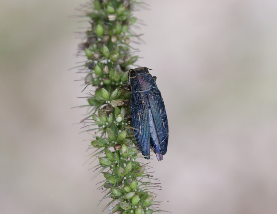 Aggiungo questa scena curiosa che ho fotografato oggi. Un Buprestis humeralis trattenuto con forza da una Setaria sp.: