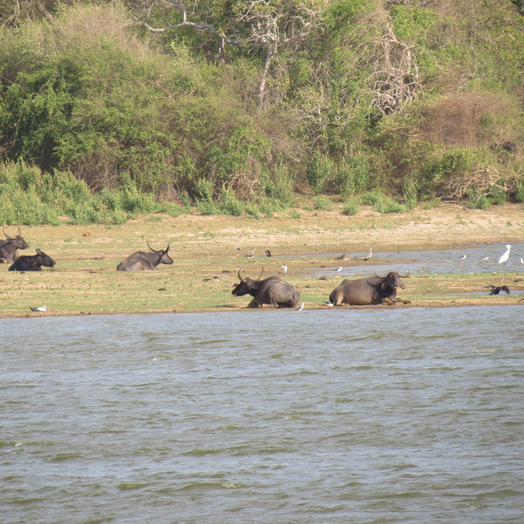 Se non sbaglio qui sono presenti otto diverse specie di uccelli (più un coccodrillo, sulla destra, per non farsi mancare niente). La specie più vistosa è il tantalo variopinto o cicogna dipinta – Mycteria leucocephala Pennant, 1769 – poi, a terra, tre esemplari di Pellicano grigio – Pelecanus philippensis Gmelin, 1789 – e quello che noi chiamiamo Cavaliere d’Italia (gli inglesi Blackwinged Stilt) – Himantopus himantopus Linnaeus, 1758 – che qui è rappresentato dalla sottospecie ceylonensis, ovviamente endemica. E’ il caso di sottolineare che il tasso di endemismo nell’isola è piuttosto elevato: secondo dati che ho trovato, il 16% delle specie animali e il 23% di quelle vegetali è esclusivo dello Sri Lanka. Un branco di bufali si gode il fango tra gli uccelli.