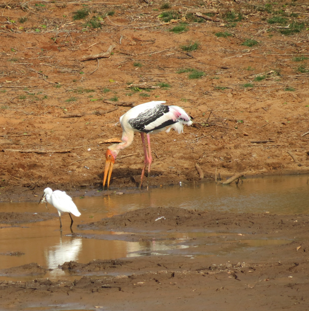 Ancora un Tantalo variopinto e una garzetta che sta divorandosi una rana. Non poteva mancare a Yala. E’ il parco con la maggiore densità di elefanti, ma in Sri Lanka, escludendo le zone più abitate, è relativamente frequente anche altrove. I cingalesi si vantano di avere la maggior densità di elefanti del mondo, ma anche qui la distruzione degli habitat ne sta riducendo il numero. Elephas maximus Linnaeus, 1758. Insieme con un Ibis testanera, un esemplare di Anastomo asiatico – Anastomus oscitans Boddaert, 1783 – un Ciconiidae caratterizzato dal becco che anche quando è chiuso lascia un’apertura tra la parte inferiore e quella superiore. Diffuso in buona parte dell’Asia.