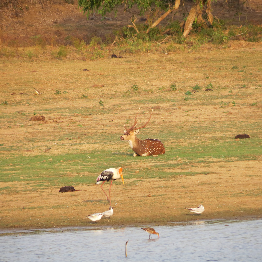 Come ho detto più sopra, agosto è periodo secco in queste zone, e ciò secondo me ha favorito la possibilità di vedere molti animali nei parchi, visto che la fauna si raccoglieva intorno ai tanti laghi, stagni e lagune. Al centro, un branco di femmine e giovani di Cervo pomellato – Axis axis (Erxleben, 1777) – detto anche chital. E’ una specie originaria di India e Sri Lanka, poi diffusa in altri continenti (anche negli USA). All’estrema destra un maschio di Gallo della giungla cingalese – Gallus lafayetii (Lesson, 1831) - endemico dell’isola. Due specie (Fringillidi?) che non ho identificato. Nonostante il titolo del post, e la frequente consultazione del manuale, è evidente che in ornitologia sono assolutamente un neofita (se avete correzioni, suggerimenti o integrazioni, sono i benvenuti).