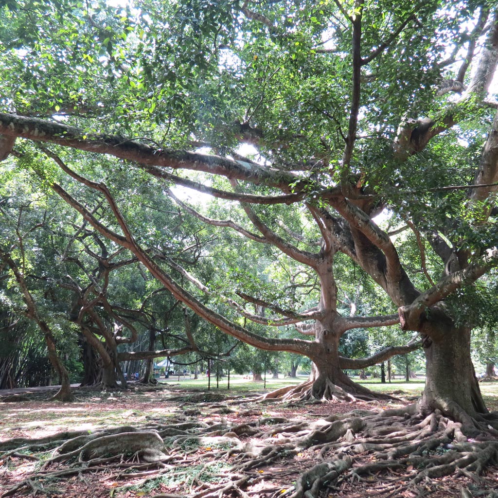 Il 14 agosto visita ai Royal Botanical Gardens, a Peradeniya. E’ il più grande e importante orto botanico del paese, la cui origine si fa risalire addirittura al 1371. Per girarlo tutto si devono percorrere parecchi chilometri. Valgono però le considerazioni fatte per il precedente: rispetto agli orti botanici di altri paesi è piuttosto trasandato. La collezione di orchidee, citata in tutte le guide, è poca cosa. Anche qui l’aspetto più impressionante è dato dai grandi alberi: Esemplare di Ficus benjamina Linnaeus, 1767 cresciuto straordinariamente in senso orizzontale, in grado di coprire un vasto prato.