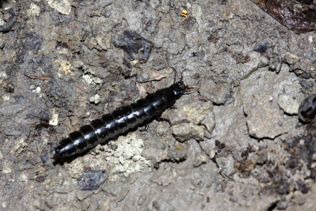 Sotto una pietra, sul greto di un torrente in secca, una larva di carabide, intorno ai due centimetri: