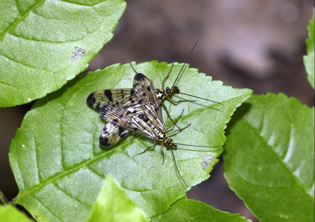 Due mecotteri in accoppiamento (Panorpa?). L'esemplare più grande, verso l'alto nella foto, si stava cibando di qualcosa. E' un dono nuziale, un meccanismo per evitare il cannibalismo durante la copula, o un fatto casuale?