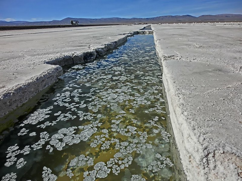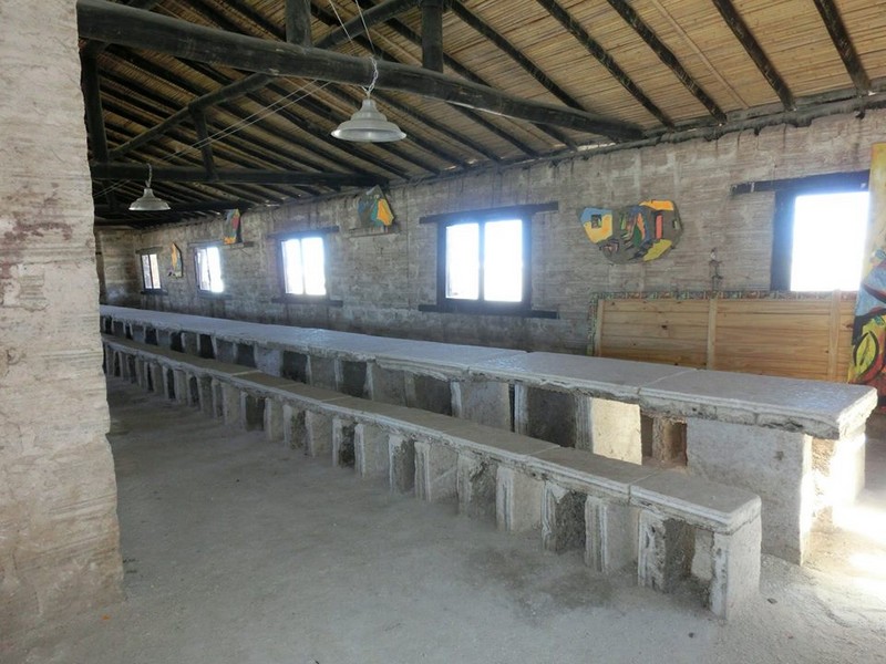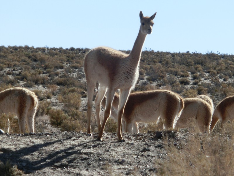 Siamo poi saliti alle Salinas Grandes: si svalica sopra i 5000m per poi ridiscendere in una infinita landa bianca. Si può pensare sia ghiaccio come quello che si incontrava all'ombra delle curve lungo la strada, ma è una distesa di sale!!! Sale a perdita d'occhio! Tra l'altro lo spessore dello strato supera i 70cm e ne hanno addirittura ricavato sculture, tavoli, sedie e mattoni con cui hanno costruito un enorme ricovero!. La strada tagliava a metà la distesa bianca, e sulla destra ruspe ed escavatori lavoravano per recuperare l'oro bianco. Prima di arrivare alla salina, sopra i 4000m si facevano simpatici incontri: un lama, dozzine di vigogne (c'erano numerosi branchi) e alcuni asinelli allevati allo stato brado. |