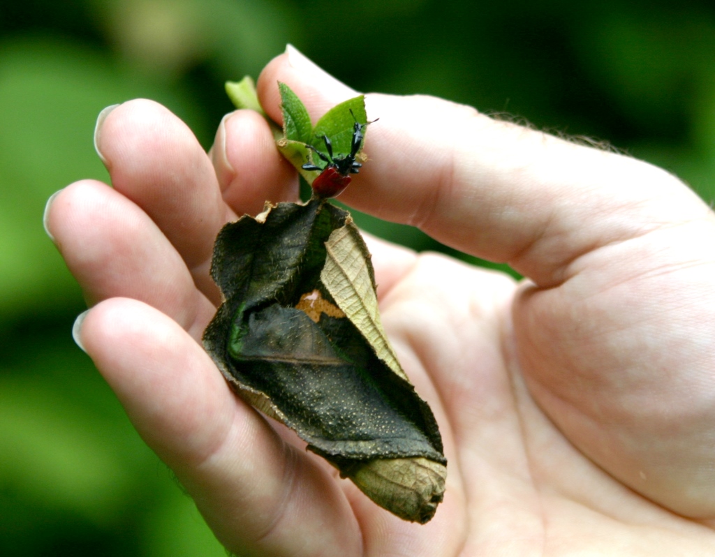 Mi restano da proporre nel forum le ultime tre specie di Apoderinae raccolte durante la spedizione in Gabon dello scorso anno. Ho comunque riordinato le poche informazioni ed immagini che ho ricavato sulla biologia degli Attelabidae/Rhynchitidae, ed ho deciso di condividerle, anche se sono piuttosto parziali. Si tratta di alcuni "sigari" che ho fotografato nelle immediate vicinanze del luogo dove risiedevamo, il Centro di Ipassa. Quasi tutti sono stati confezionati con le foglie di Alchornea cordifolia, un arbusto appartenente alla famiglia Euphorbiaceae, comune intorno alle nostre casette. Sfortunatamente a nessuno di questi sigari è associata una specie di attelabide: contrariamente ad altre situazioni* che ho avuto modo di investigare, non ho mai trovato in Gabon esemplari intenti a costruire i loro sigari o comunque associabili ad essi.