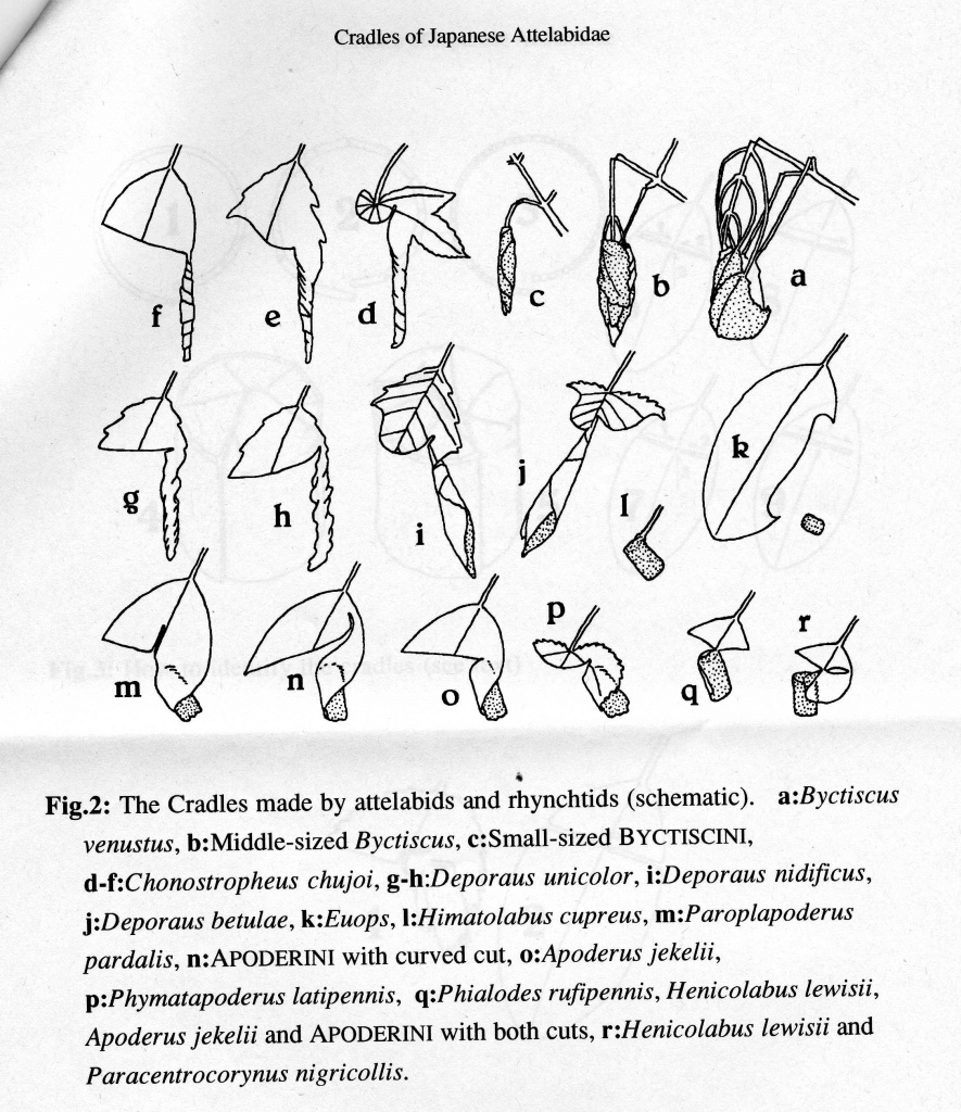 Per aiutare nell'interpretazione delle prossime immagini, propongo una tavola da un lavoro di Y. Sawada (1989): Cradles made by Attelabidae of Japan.
