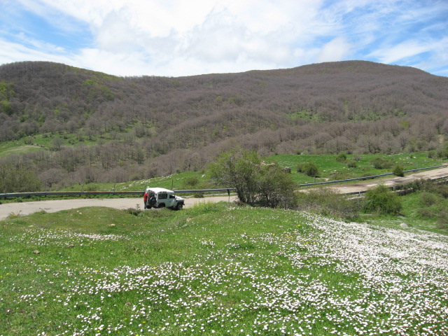 Buongiorno a tutti! La settimana scorsa (1/V/2014) ho avuto la possibilità, grazie a mio padre  , di trascorrere una bella giornata in giro per i Nebrodi. Devo dire che mi è stata molto gradita soprattutto dal punto di vista paesaggistico, poichè gli ambienti che mi accingo a mostrarvi li conoscevo solo in abito estivo: vederli di primavera è tutta un' altra storia, anche per quanto riguarda gli entomi. Caronia è il più vasto comune (226 kmq) della Provincia di Messina, è sede dell' Ente Parco dei Nebrodi, essendo il più importante del comprensorio montuoso (basti pensare che i Nebrodi vengono anche chiamati "Caronie"). E' inoltre uno dei comuni più selvosi in Sicilia: il territorio si estende dalle coste tirreniche (frazioni di Caronia Marina, Canneto e Torre del Lauro) fino alla dorsale dei Nebrodi, con vette di oltre 1600 m, e in alcuni punti il bosco arriva quasi fino al mare. La vegetazione è quanto mai varia ed è distribuita in base all' altitudine e all' esposizione dei versanti: indicativamente, alla macchia mediterranea si succedono la sughereta (fino a 800 m ca), la cerreta (fino a 1000 m), il bosco misto di faggio e cerro (fino a 1300 m) fino ad arrivare alla splendida faggeta pura di portella dell' Obolo (1500 m). Ecco come si presentano i suoi boschi in abito primaverile: Portella Pomo (823 m s.l.m.): querceto misto (sughereta-cerreta) con fitto sottobosco di Ruscus aculeatus, Crataegus sp., Rubus sp.. Castello dell' Impallaccionata (o Casina di Pietratagliata) (837 m s.l.m.): antica residenza nobiliare immersa nella cerreta. Qui ho avuto un incontro spiacevole: una mandria di bovini pascolava tranquillamente ed io altrettanto tranquillamente fotografavo i dintorni e controllavo le loro fatte; dopo un pò mi vedo puntato da una vacca decisamante irritata: sono costretto a fuggire rifugiandomi sulla jeep... probabilmente teneva nascosto dietro il castello il suo vitellino appena nato, poichè tutte le altre mucche erano ancora gravide... PS: si parla in questi giorni sul Forum di incontri spiacevoli con animali durante le nostre uscite: ecco il mio...