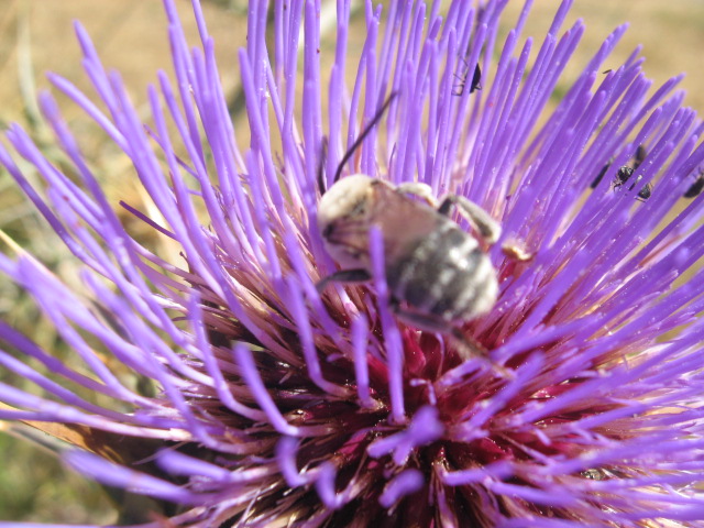 Incontro anche delle Stenurella bifasciata bifasciata (O. F. Müller, 1776), alcune di esse in copula. Sui carciofini selvatici moltissimi imenotteri: oltre alle comuni Xylocopa, erano presente queste Megachilidae (?) Anche gli emitteri non mancano: raccolgo Spilostethus saxatilis, Carpocoris mediterraneus atlanticus e Coraeus marginatus, di cui noto una vera esplosione demografica sui carciofini selvatici: Concludo qui, spero di non essere stado troppo tedante. Alla prossima!