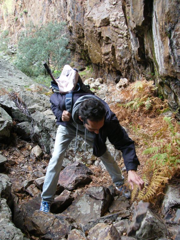 Giunti a un tratto della gola decidiamo di fermarci e esaminare le pietraie e i detriti alla base delle pareti...