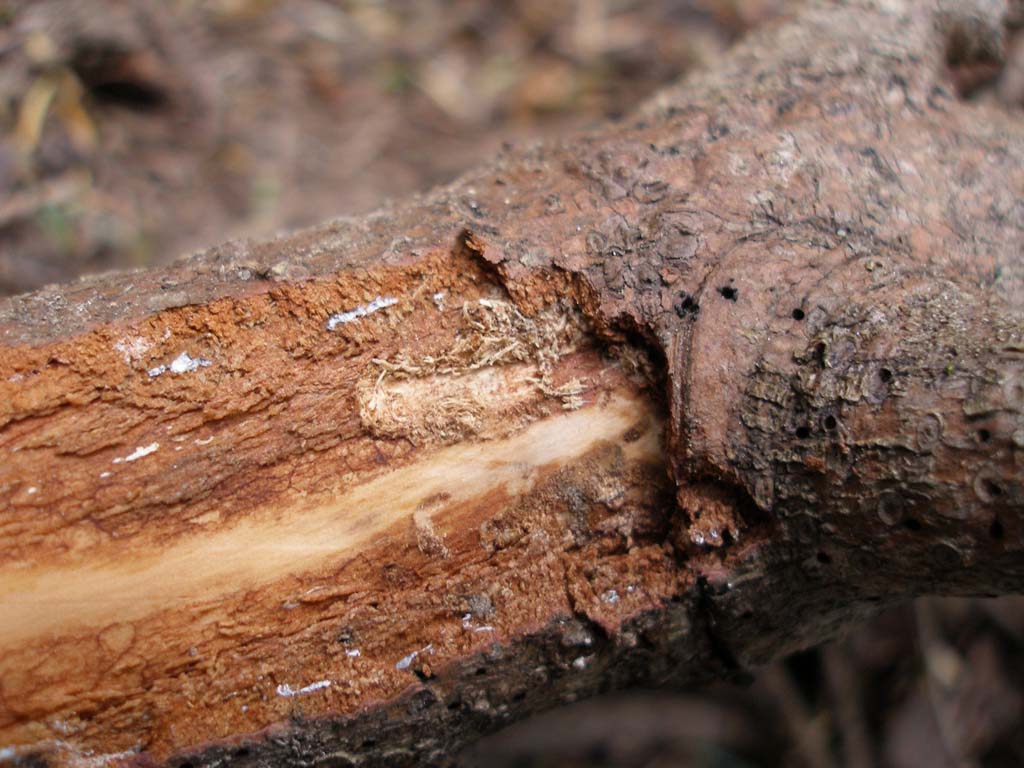 Scortecciando un rametto (diametro 3 cm circa) metto allo scoperto un accenno di galleria larvale subcorticale con la rosura tipica di Pogonocherus eugeniae Ganglbauer, 1891