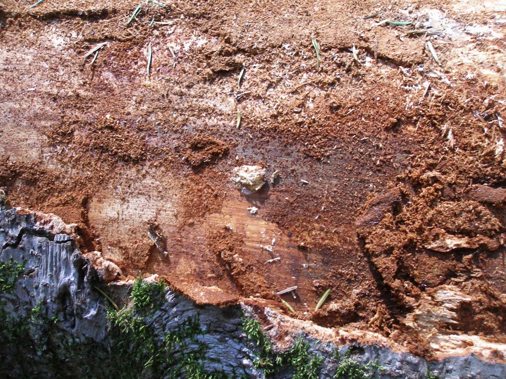 Un grosso tronco è percorso, in tutta la sua lunghezza (una trentina di metri) da vecchie gallerie larvali con centinaia di fori di uscita di un Cerambicide che non posso che attribuire a Tetropium castaneum (Linnaeus, 1758), una specie comune sulle Alpi, ma nota di poche regioni in Italia e apparentemente rarissima in Romagna, di cui sono noti solo tre esemplari. Le gallerie larvali, relativamente profonde, interessano sia la parte interna della corteccia che l’alburno.