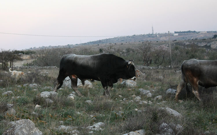 Sento dei campanacci all’orizzonte, è una mandria di vacche podoliche che si reca al dormitorio guidata dal loro pastore e dai fedeli maremmani. Quasi tutte hanno il vitellino che non si separa mai dalla mamma! Che teneri!!