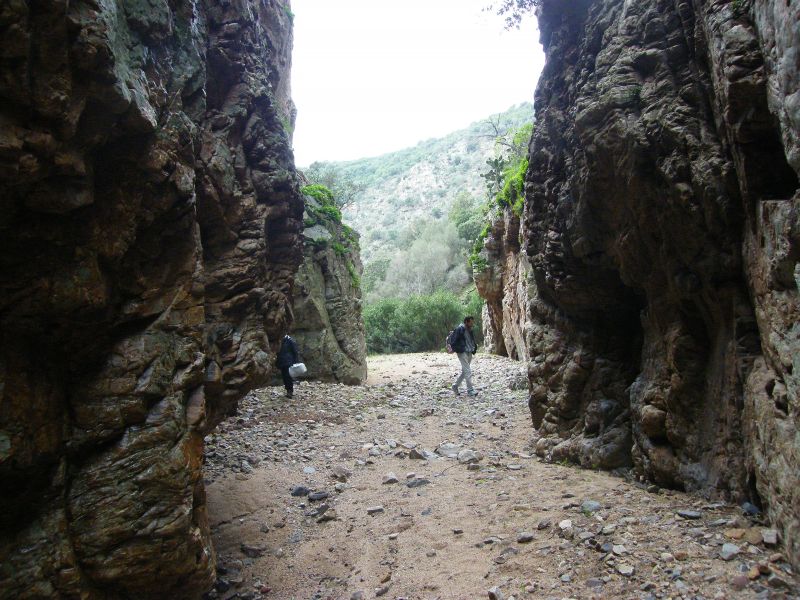 Ieri mattina (11.I.2014) guidati dall'amico Davide Cillo, esperto conoscitore del territorio sardo, io e Adriana Lecis, formidabile malacologa e entomologa, siamo andati alla Gola di Is Cioffus dove abbiamo passato alcune ore di ricerche entomologiche. Si tratta di una affascinante e suggestiva gola scavata dal rio omonimo (Rio Is Cioffus) con pareti pressochè verticali alte centinaia di metri nei monti del territorio comunale di Sarroch a una trentina di chilometri da Cagliari. I partecipanti  : Adriana chinata a esaminare il contenuto del retino per acquatici e lo scrivente in piedi