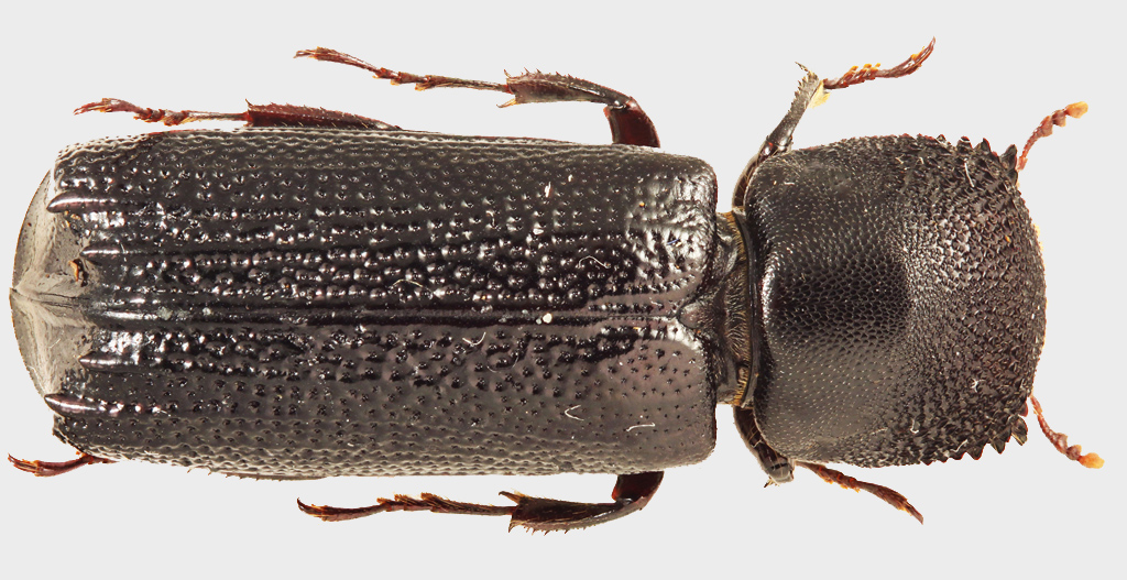 Questo bestione (16 mm) è arrivato alla luce a Ipassa; ne ho alcuni altri simili, anche leggermente più grandi. Viste le antenne, non sono sicuro che sia un Platypodinae: non ho mai approfondito la sistematica di queste sottofamiglie e credo di confonderli ancora con gli Scolytinae (nelle scatole di materiale gabonese li ho messi insieme).