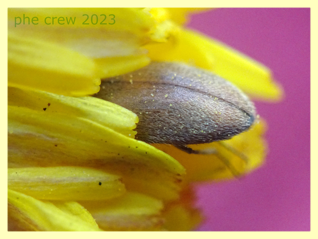 ...Attagenus simplex, 3 / 4 individui su Asteraceae alcuni che facevano capolino dai fiori. Circa 4 mm. |