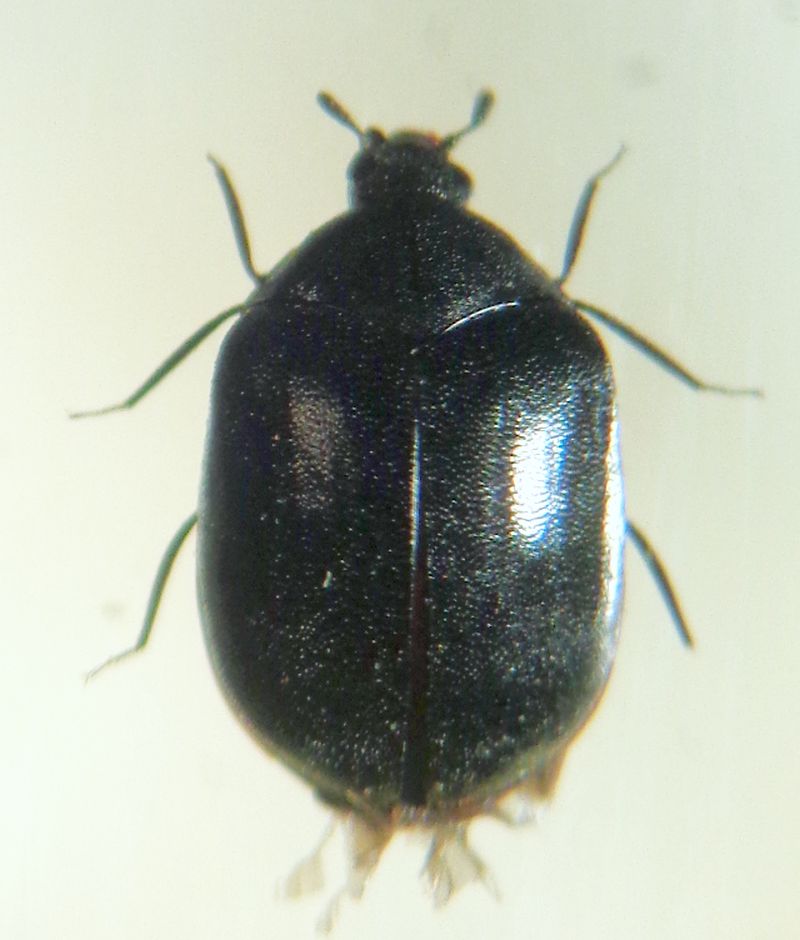 Non si tratta di Orphilus niger, bensì di un Anthrenus probabilmente del sottogenere Nathrenus. Si denota sia dalla presenza di scaglie nella seconda foto, verso sinistra, sia dalla clava antennale a 3 articoli ma con 11 segmenti antennali (chiave per i sottogeneri Anthrenus e Nathrenus) e sia per la lamina metacoxale che non si estende ai lati del corpo. Vi consiglio di seguire le chiavi per le sottofamiglie, con dubbi come questo. La perdita di scaglie negli Anthrenus è piuttosto comune, basta infatti un urto per apparire "glabro". Ecco perché sono parecchio complicati da preparare... sono di fatto delle farfalle di 3 mm sotto questo punto di vista. |