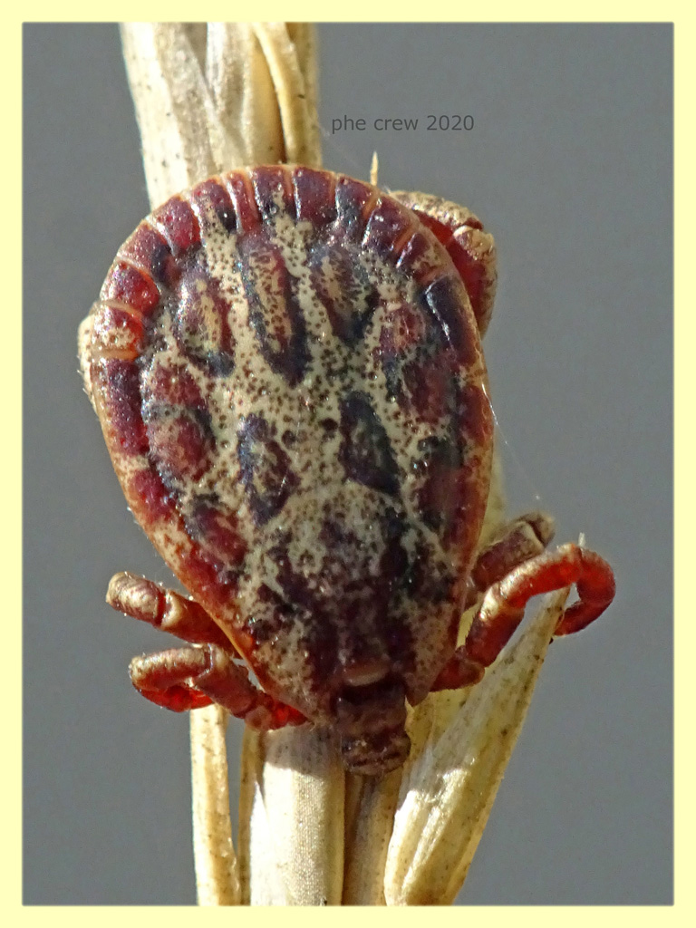 Per i macrocaratteri visibili in foto propendo per maschio di Dermacentor reticulatus (Fabricius, 1794), che rispetto a marginatus Sulzer, ha punti grossi e profondi sui festoni posteriori e sul dorso rari grossi punti.