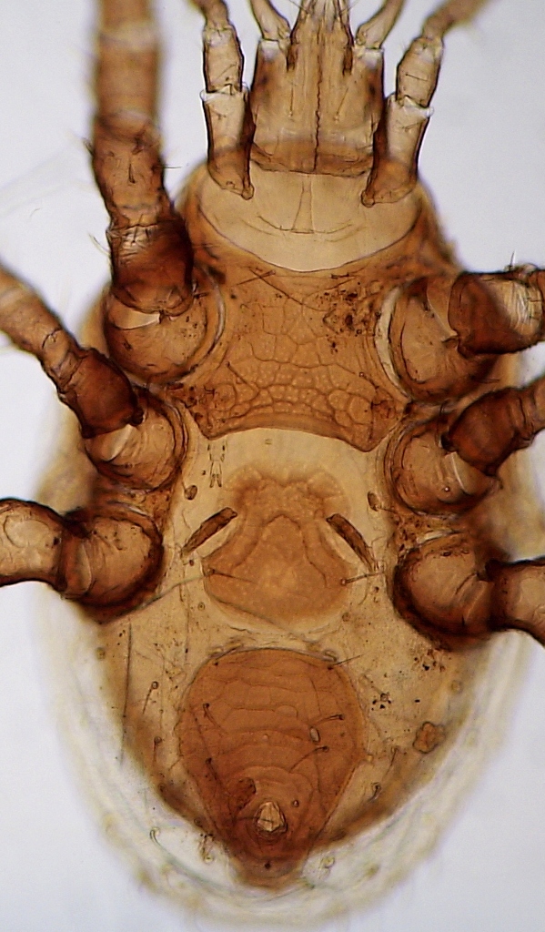 Ecco alcune immagini a titolo di esempio che potrebbero essere più utili (ma non è detto) per la determinazione degli acari. Ho scelto una specie che era già stata proposta da Nicola qui, così è più facile fare un paragone. Gli esemplari sono stati parzialmente chiarificati in acido lattico puro (a freddo) e montati poi in preparati microscopici. Le immagini sono state realizzate al microscopio biologico (bidimensionale) con luce trasmessa. Le dimensioni si aggirano intorno ai 1200 um per gli esemplari in toto, escluse le zampe.