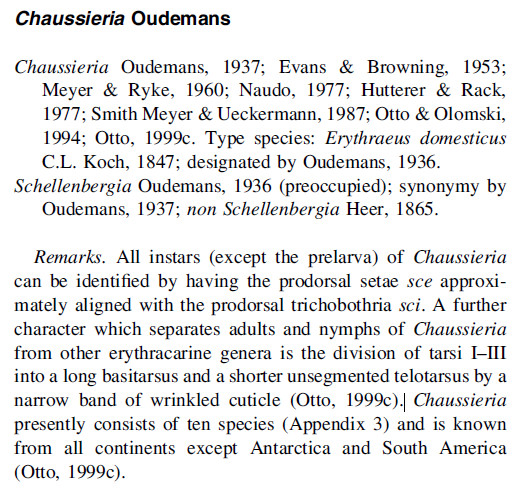 Queste "sporgenze subcuticulari postoculari" sono probabilmente organi sensoriali e costituiscono un carattere distintivo assolutamente primario in quanto sono presenti solo in Erythracarus e Chaussieria (Erythracarinae Erythracarini sensu J.C. Otto 2000, p. 455) ma solo in Chaussieria raggiungono tali dimensioni, mentre in Erythracarus sono solo appena accennate.