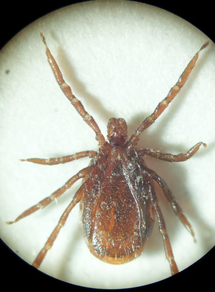 Ho notato che nel forum mancano foto del maschio di questa specie che tra l'altro ha una interessante prerogativa comune a tutti i maschi di Ixodini e cioè che nella fase adulta non si nutre e quindi se ve lo trovate addosso, tranquilli, è solo perchè speravano di fare l'incontro della vita con una compagna che vi avesse prescelto come prima portata. Ciò è dovuto al fatto che la spermiogenesi è già completa alla fine dello stadio ninfale e perciò non necessita di ulteriori pasti dell'adulto (che quindi si è nutrito appena due volte nella vita). Le dimensioni, quindi invariabili, sono sui 2,5 mm. Proprio per i neofiti assoluti, dirò che il maschio, a differenza della femmina, ha lo scudo chitinoso dorsale che occupa quasi tutto il dorso (idiosoma), lasciando scoperto solo uno stretto margine periferico più chiaro. Se non lo allontanate voi, lo farà spontaneamente quando si accorgerà, annusando quà e là, che non c'è... trippa per gatti e che conviene cambiare ospite. Ecco l'ultimo arrivo in collezione (recto, versus, recto).