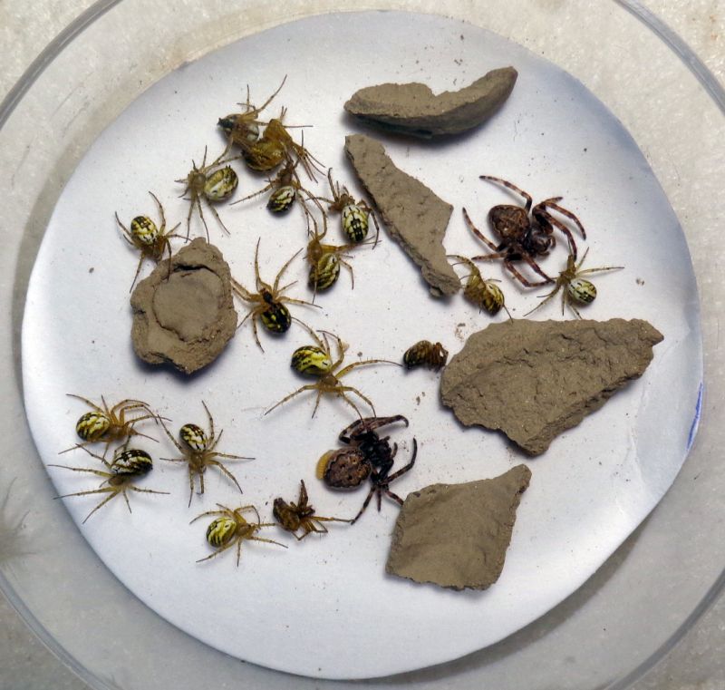 Grazie Claudio e Luigi: trovo che S. curvatum faccia pareti meno spesse e in generale ben più fragili tra gli altri del genere e anche di Chalybion spp., parlando ovviamente di cellette singole. nella foto, il pezzetto a sx reca l'opercolo di chiusura e gli altri mostrano spessori variabili, ma in parte piuttosto notevoli (da1 a 2 mm. Non pensavo le due specie fossero entrambe Araneidae.