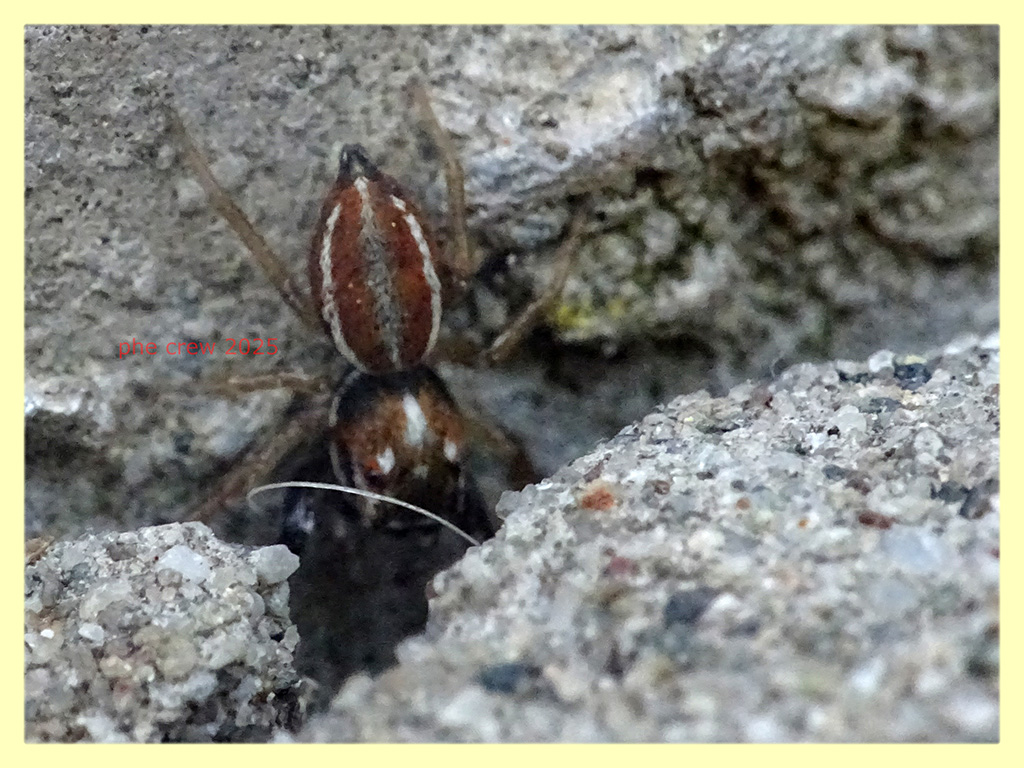 ... anche se sono brutte foto, arrivo a maschio di Icius hamatus...per i seguenti caratteri: l' addome e' molto piu' rosso in confronto a I. subinermis che lo ha prevalentemente nero, la linea bianca che corre intorno all' addome e' continua e non si spezza all' altezza delle "spalle" cio che accade in I. subinermis, la striscia centrale sempre dell' addome e' grigiastra invece che bianca e inoltre il clipeo non ha peli bianchi. |
