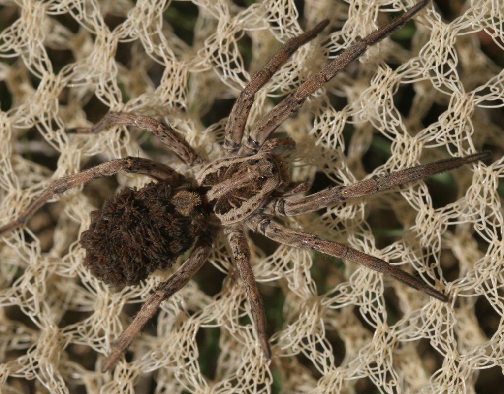 Spero di non fare qualcosa di sbagliato attaccandomi a questa discussione. A me sembra lo stesso ragno, e queste due immagini documentano il comportamento delle femmine sopra citato. La foto è stata scattata in un uliveto vicino a Monteguidi, Casole d'Elsa (SI) il 1/11/2009, durante la raccolta delle olive (il ragno sta camminando sulla rete appena stesa a terra). Solo qualche giorno più tardi, riguardando le foto dopo esser tornato a Milano, mi sono accorto delle decine di ragnetti che ricoprono l'addome della madre.