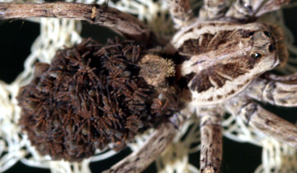 00xyz00 ha scritto: Hogna radiata - Araneae, Lycosidae. Dovrebbe essere una femmina visto che in questo periodo, normalmente, i maschi sono gia defunti. Probabilmente non si è accoppiata (è piuttosto magrolina) altrimenti avrebbe avuto i piccoli sul dorso come tipico della famiglia. Per quanto ho avuto occasione di osservare quella forma sottile a affusolata dell'opistosoma potrebbe indicare anche che i piccoli hanno lasciato da poco il dorso della femmina. Non so perché, ma è una forma innaturale, piuttosto cilindrica, che ho osservato solo in quell'occasione. Allego una foto di una femmina che avevo allevato e avevo appena "aiutato" a far scendere i figli, che un mese dopo la schiusa non si volevano decidere.  luigi