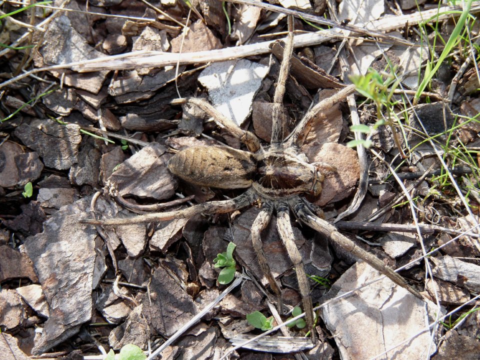 Hogna radiata - Araneae, Lycosidae. Dovrebbe essere una femmina visto che in questo periodo, normalmente, i maschi sono gia defunti. Probabilmente non si è accoppiata (è piuttosto magrolina) altrimenti avrebbe avuto i piccoli sul dorso come tipico della famiglia.