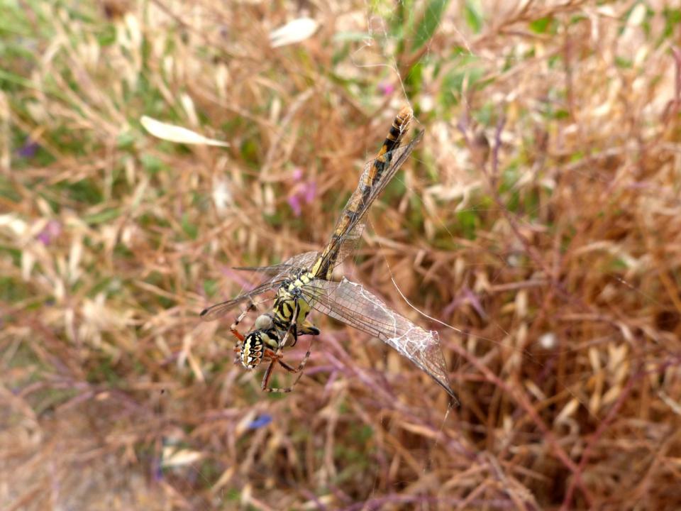 Esatto! Neoscona adianta. Un ragno che cattura spesso prede grandi, come le libellule. |