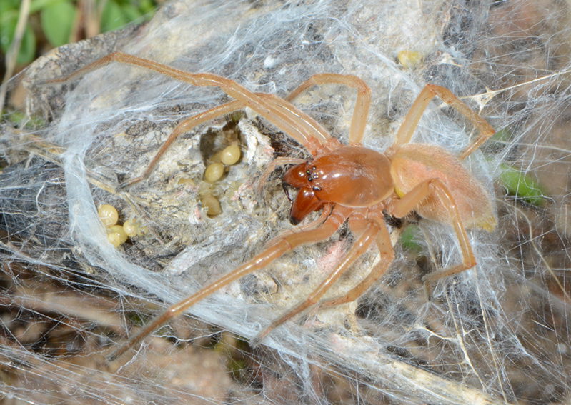 Una femmina a guardia della prole. Per quanto riguarda la famiglia dovrebbe essere un Clubionidae (salvo errori; al limite potrebbe essere uno Gnaphosidae, ma non credo). Assomiglia molto a Clubiona diversa, può essere? |