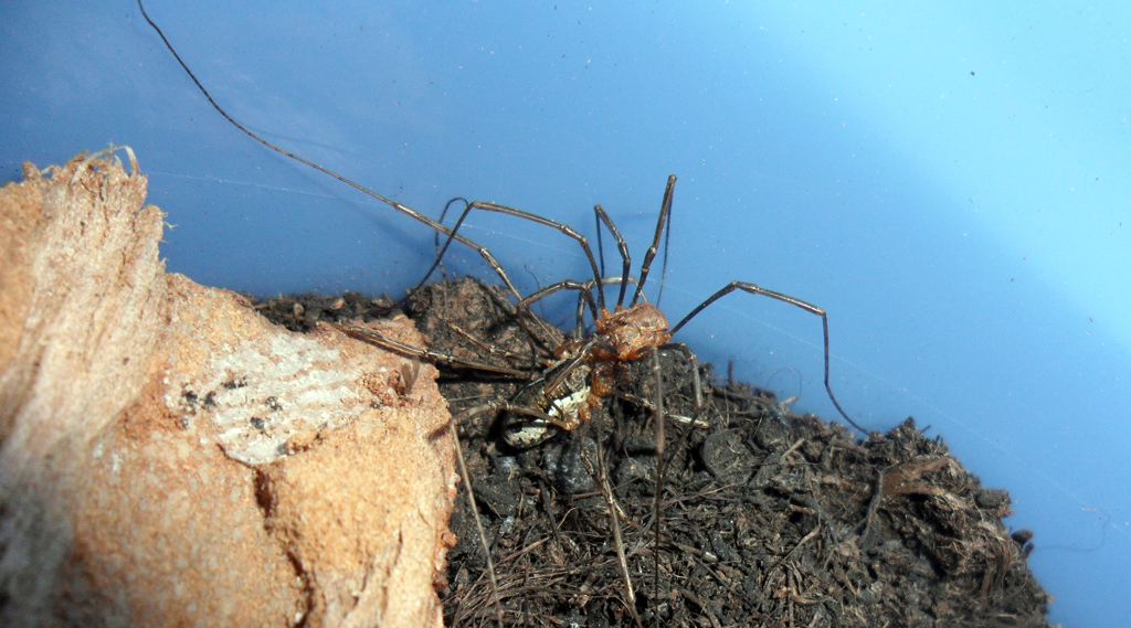 Pochi giorni fa ho raccolto due esemplari: uno identico a questo e un'altro quasi identico ma più piccolo e con le bande laterali marroni e non bianche. Ho subito pensato che fossero maschio e femmina e quindi li ho messi in un terrarietto. Oggi ne ho raccolto un'altro marrone e più piccolo e lo ho messo insieme agli altri due. Spero di assistere alla riproduzione Il mantenimento di questi animali è semplicissimo. Ho preso un secchiello che conteneva mozzarelline e ho fatto una finestra per l'areazione sul coperchio. Ho messo alcuni centimetri di terriccio per fiori e varie cortecce per creare nascondigli. Umidifico con uno spruzzino a giorni alterni. Il nutrimento è la parte più semplice: in casa entrano spesso delle mosche, quindi dopo averle uccise le butto nel terrarietto e dopo pochi minuti arriva un esemplare per mangiarle. Ecco il terrario. Uno degli ospiti Lo stesso esemplare di prima fotografato alcuni minuti fa mentre mangiava un Geometride trovato morto in veranda.